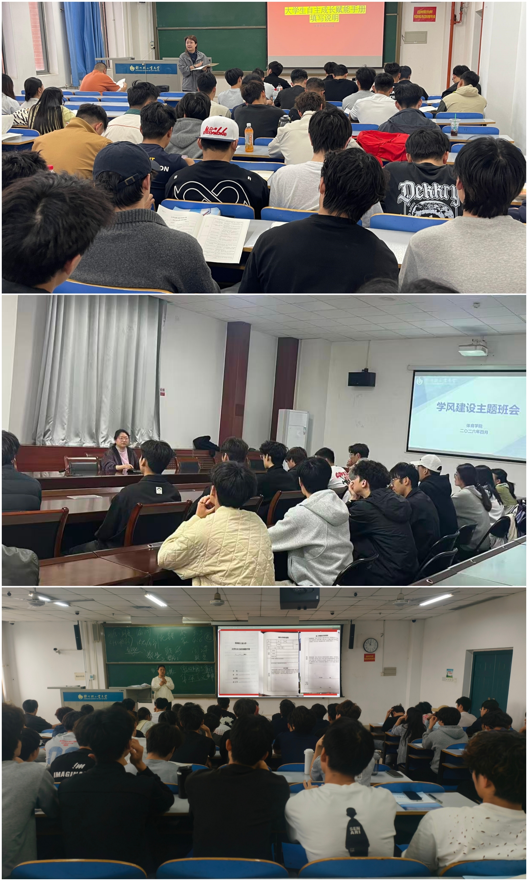 班会伊始,各班级辅导员结合不同年级专业学习特点,带领学生系统学习《郑州轻工业大学大学生自主成长赋能手册》的内容,并聚焦学生在课堂学习与日常生活中存在的突出短板,强调了《学生手册》、《学生宿舍安全规定》、《宿舍卫生创建标准及宿舍行为规范》的主要内容,以及规范日常行为习惯的重要性。接着,班主任结合本学期班级学习纪律、日常表现、学风建设等实际情况,清晰地阐释违规违纪的严重后果,希望大家对照标准自查自省,将规则意识融入日常学习与生活。最后,同学们结合学习困惑展开交流,纷纷表示会严格遵守课堂纪律,努力锤炼专业本领,提升自身核心竞争力。